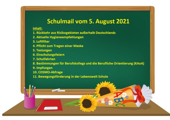 Die Schulmail vom 5. August 2021 macht zu folgenden Inhalten weitere Aussagen: Rückkehr aus Risikogebieten außerhalb Deutschlands Aktuelle Hygieneempfehlungen Luftfilter Pflicht zum Tragen einer Maske Testungen Einschulungsfeiern Schulfahrten Bestimmungen für Berufskollegs und die Berufliche Orientierung (KAoA) Impfungen COSMO-Abfrage Bewegungsförderung in der Lebenswelt Schule Quelle: Schulmail vom 05.08.2021 Zur Original-Schulmail auf der Seite des MSB