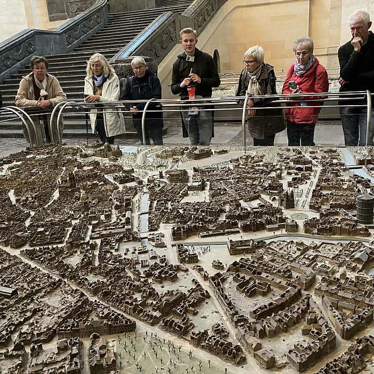 Der thematische Schwerpunkt des zweiten Tages war das neue Rathaus inklusiv der Kuppelbesichtigung mit dem berühmten Bogenaufzug, ansprechend dargestellt durch die Stadtführerin Gertrud Eckhardt. Von 1901 bis 1913 wurde das Rathaus zu einem schlossähnlichen Prachtbau erbaut. Wegen des feuchten Untergrundes wurde es gegründet auf 6026 Buchenpfählen. In äußerst beeindruckender Weise wurde die Entwicklung der Stadt vom Mittelalter bis heute dargestellt durch sehr ansprechende Stadtmodelle der einzelnen Epochen. Uns hat erschüttert, wie groß das Ausmaß der Zerstörung im zweiten Weltkrieg war.