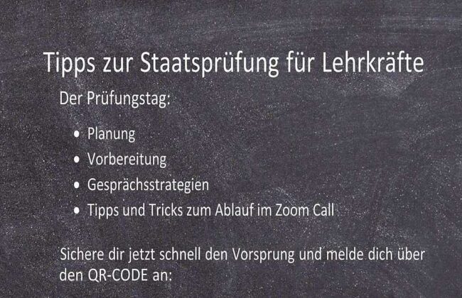 Tipps zur Staatsprüfung für Lehrkräfte am 16.01.2023 in der Zeit von 16:00 Uhr bis 18:00 Uhr Sie erhalten allgemeine Informationen zum Prüfungstag: Planung Vorbereitung Gesprächsstrategien Tipps und Tricks zum Ablauf im Zoom Call Im Verlauf unserer Online-Informationsveranstaltung haben Sie die Möglichkeit, Ihre Fragen zu stellen. Referenten sind: Sarah Wanders und Hardi Grunder von lehrernrw Zum…