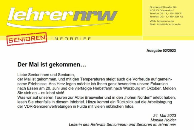 Ausgabe 02/2023 Ausblick und Rückblick auf Veranstaltungen von und für Senioren/Seniorinnen Liebe Seniorinnen und Senioren, der Mai ist gekommen, und mit den Temperaturen steigt auch die Vorfreude auf gemeinsame Erlebnisse. Ans Herz legen möchte ich Ihnen ganz besonders unsere Exkursion nach Essen am 20. Juni und die viertägige Herbstfahrt nach Würzburg im Oktober. Melden Sie…
