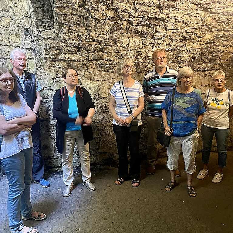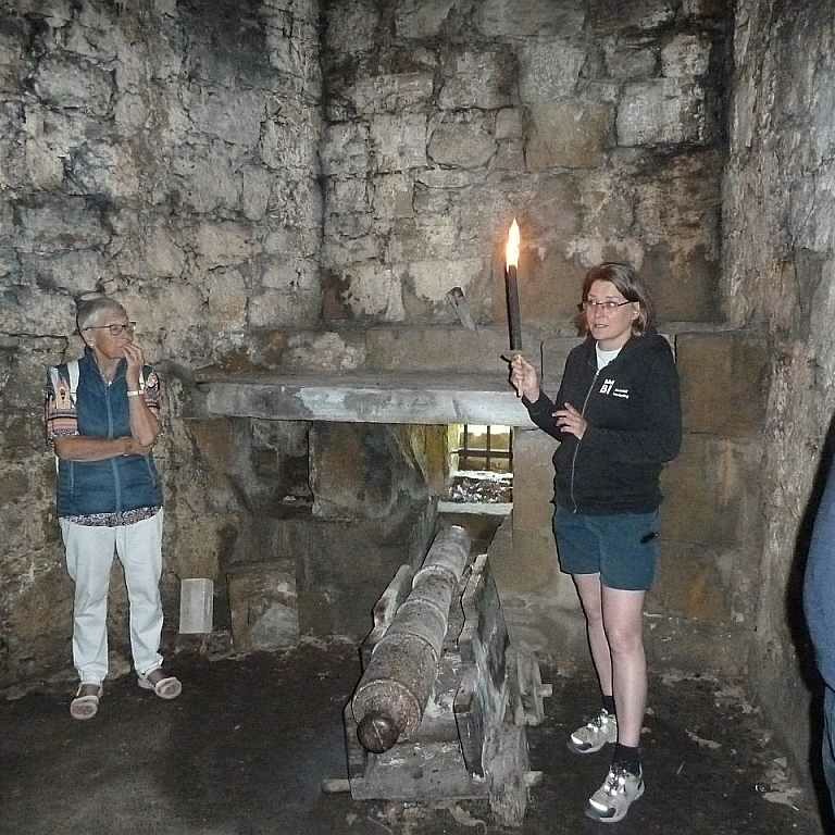 Bei der Führung durch einen Teil der 300 m langen Kasemattengänge mit der Burgwartin Frau Sukolowsky erhielten wir spannende Einblicke in die Verteidigungsstrategien von Stadt und Burg und in das Leben der Soldaten und Söldner. Sie wurden zwar gut bezahlt, doch wie sollten sie das Geld ausgeben? Nur einmal im Monat durften sie die Kasematten verlassen, aber die Stadt durften sie nicht betreten. Das war der Grund für die Einrichtung eines Marktes zwischen Stadt und Burg, wo das Geld der Soldaten willkommen war.