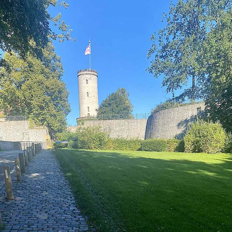 Bielefeld gibt es! Und das seit wahrscheinlich 1214, als die Siedlung das Stadtrecht erhalten haben soll. Doch erst um 1250 bauten die Grafen von Ravensberg auf dem Bergsporn über Bielefeld ihre Burg, die Sparrenburg, um den Pass, einen der wenigen Übergänge über den Teutoburger Wald, und die Stadt zu sichern. Durch ihre Lage 60 m über Bielefeld war sie ein idealer Beobachtungspunkt über das gesamte Umland.
