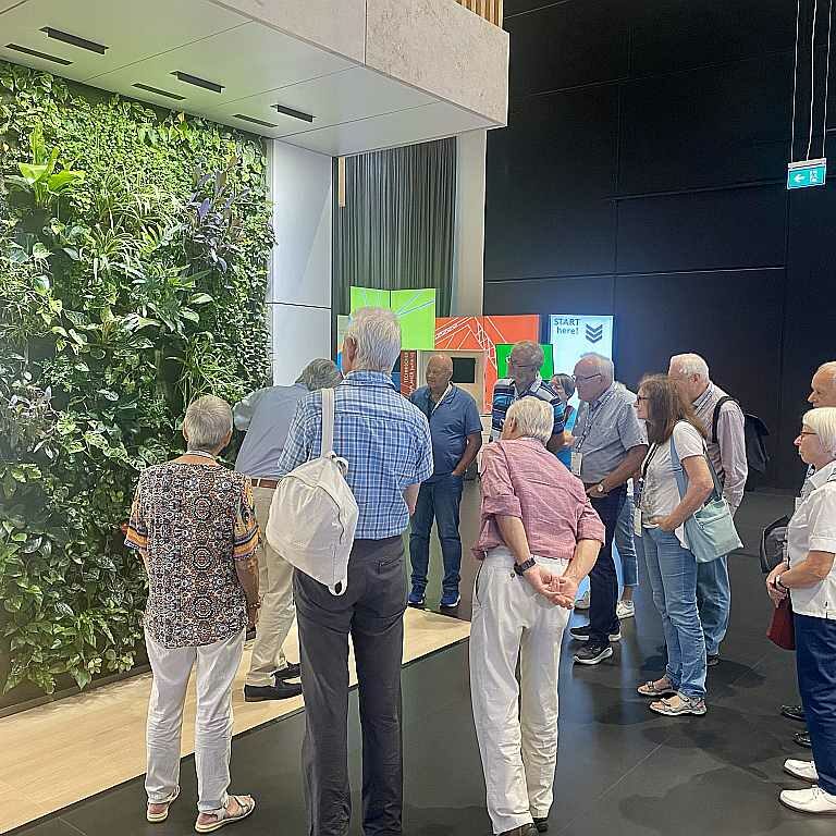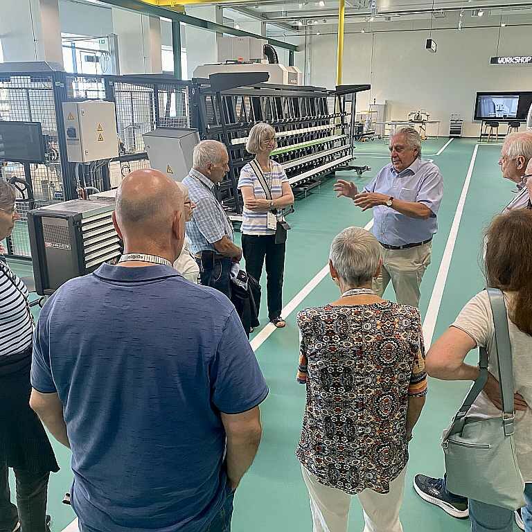 Ganz anders war der Besuch bei Schüco, einem weltweiten Unternehmen, das nicht Fenster, wie oft angenommen, sondern Profile und Fassaden in unterschiedlichen Ausführungen herstellt. So wurden uns mit echten Pflanzen begrünte Fassaden, Sicherheitsfassaden, feuerfeste Fassaden sowie Hybridfassaden vorgestellt. Auch Türen und Fronten, denen weder Sprengstoff noch Feuer – zumindest für bis zu 30 bzw. 90 Minuten – etwas anhaben konnten, sowie von KI betriebene Werkzeuge und Maschinen wurden uns bei einer sehr unterhaltsamen Führung präsentiert.
