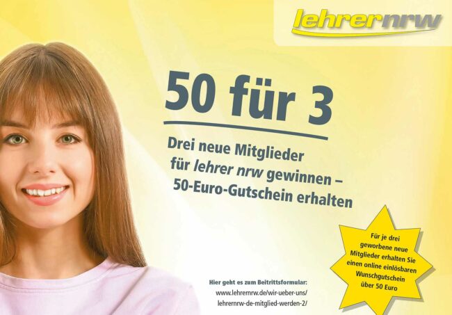 lehrer nrw Mitglied werden, Mitglied werben lehrer nrw hat eine Mitgliederwerbeaktion gestartet, die in zweierlei Hinsicht attraktiv ist: Neu-Mitglieder profitieren von vielen Vorteilen in einem starken Verband, und Alt-Mitglieder können sich eine Prämie verdienen. Es gibt eine Menge guter Gründe, Mitglied im lehrer nrw zu sein. Eine exzellente Rechtsberatung, ein vielfältiges Fortbildungsprogramm, umfangreiche Service- und…