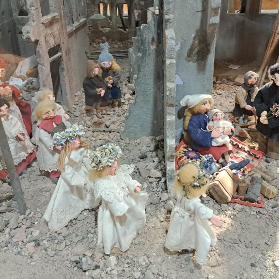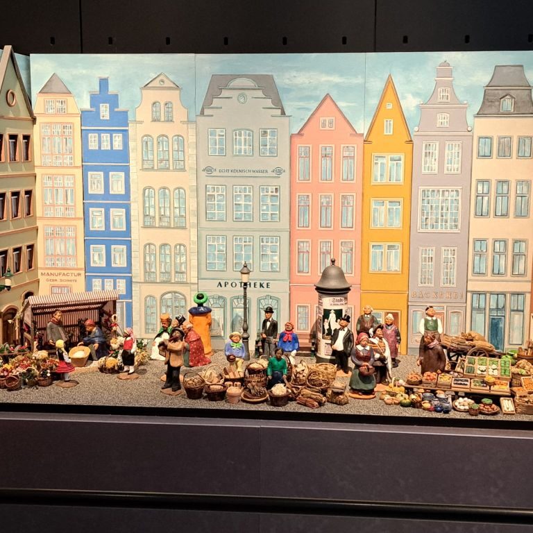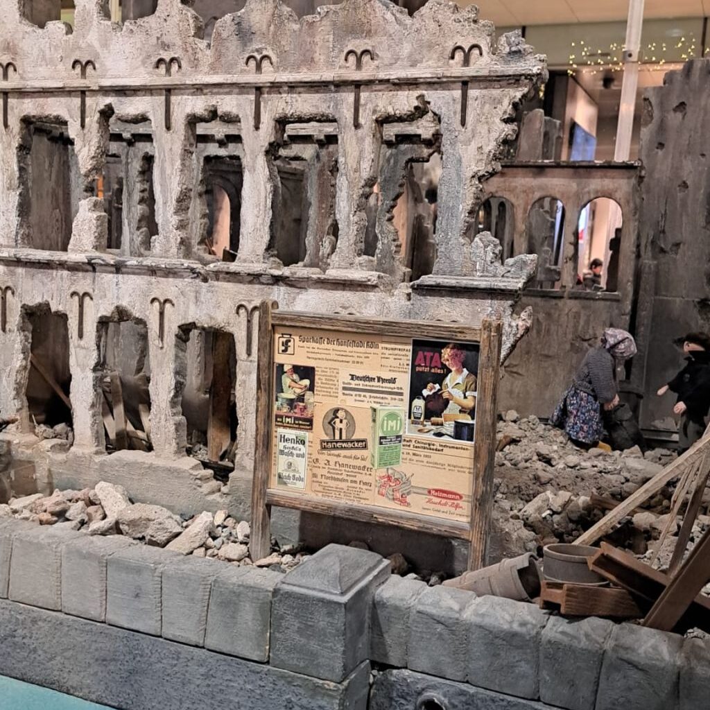 Aber es zeigt sich in den Darstellungen eben auch der ‘Kölsche Überlebenswille‘ mit einem Weihnachtsmarkt oder einem Versuch zur Wiederbelebung des Karnevals – trotz Kälte, Hunger und Wohnungsnot. Es lohnt sich, längere Zeit diese Friedenskrippe von allen Seiten zu betrachten.