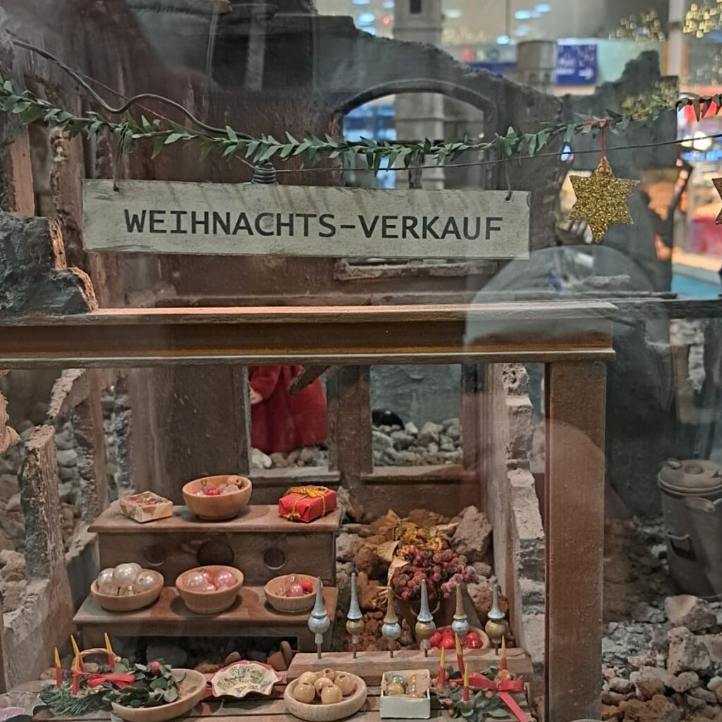 Die ebenso interessante wie unterhaltsame Führung begann am 3. Dezember im Hauptbahnhof bei der Friedenskrippe. Diese Krippe zeigt Motive zwischen den Jahren 1938 bis 1946. Die Gebäude sind gemäß der Zerstörungen im Zweiten Weltkrieg, vorwiegend durch Brandbomben, sehr realistisch dargestellt. Genau so realistisch zeigen die Figuren die damalige Not. Zu sehen sind Kinder beim Einsammeln von Ziegelsteinen und Kohlestücken, die angeblich von Eisenbahn-Waggons heruntergefallen waren.