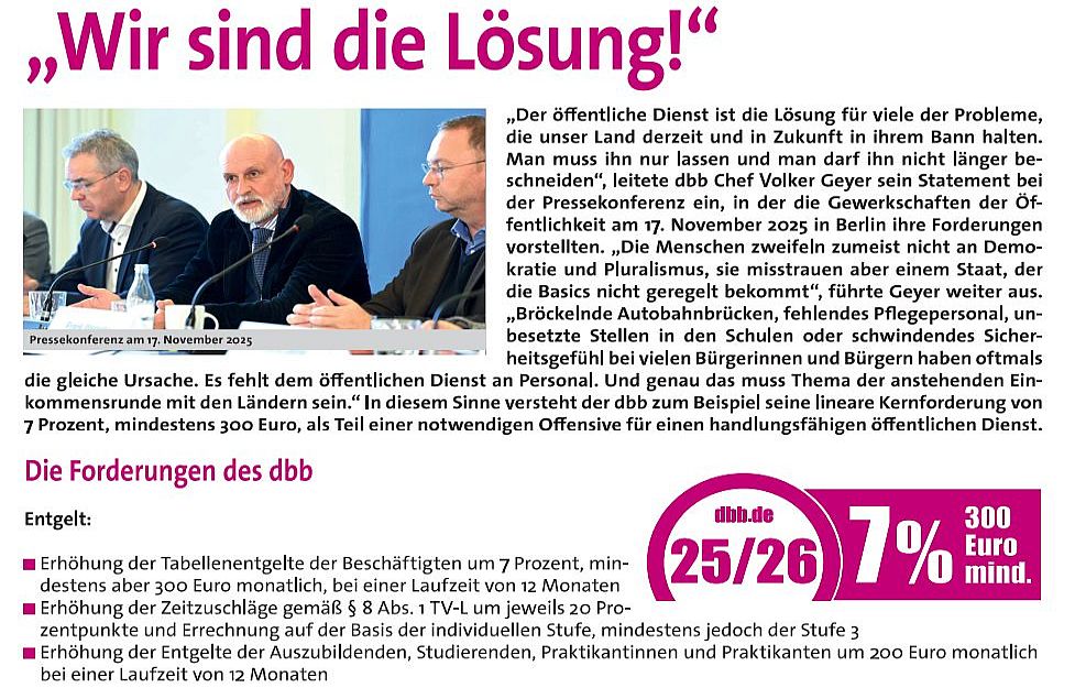 Der dbb Beamtenbund und tarifunion (dbb), der Dachverband von lehrer nrw, geht mit einer Forderung von 7% sowie weiteren strukturellen und berufsspezifischen Erwartungen in die Tarifverhandlungen für die Beschäftigten bei den Ländern. Alle tarifbeschäftigen Lehrkräfte in den Bundesländern sowie das zusätzliche pädagogische Personal an den Schulen sind hiervon betroffen, aber auch die beamteten Lehrkräfte, auf die das Ergebnis anschließend übertragen werden soll.