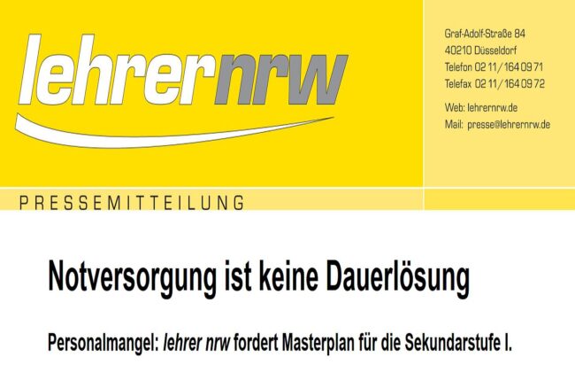 Pressemitteilung Personalmangel: lehrer nrw fordert Masterplan für die Sekundarstufe I. Das Bemühen der Landesregierung, den Lehrkräftemangel abzufedern, verdient Anerkennung, doch auch das nun vorgestellte Modell zur Stellensteuerung ist nur ein Tropfen auf dem heißen Stein. Tatsächlich wird sich die Personalnot insbesondere an den Haupt- und Realschulen im kommenden Schuljahr noch erheblich verschärfen. Denn dann werden…