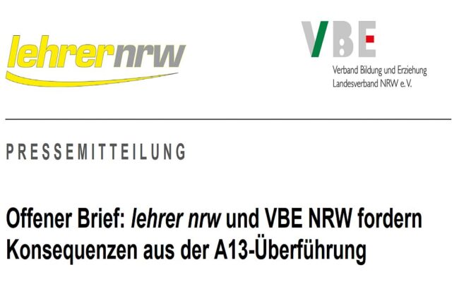 Gemeinsame Pressemitteilung von lehrer nrw und VBE lehrer nrw und der Verband Bildung und Erziehung (VBE NRW) haben sich mit einem gemeinsamen offenen Brief an Schulministerin Dorothee Feller gewandt. Der Grund für den ungewöhnlichen Schritt: Am 1. August 2026 werden mit dem Ende des auf vier Jahre angelegten Stufenplans zur Überführung der Eingangsbesoldung für alle…