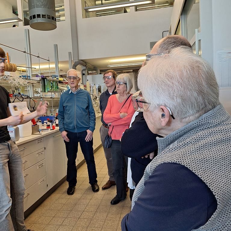 Nach einer kurzen Einführung in einem Hörsaal erhielten die Teilnehmenden Einblicke in verschiedene Arbeits- und Forschungsbereiche. In einem Projekt z. B. wird erforscht, wie Biomasse anstelle von Erdöl als Rohstoff für chemische Produkte genutzt werden kann. Aber auch der Aufbau und die Arbeitsweise eines Gaschromatographen zur Analyse oder die Druckkammern im Technikum wurden uns erklärt. Bei allen Begegnungen wurde uns deutlich, wie sehr die Mitarbeiter und Wissenschaftler für ihre Forschung brennen.
