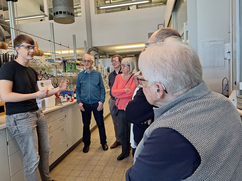 Nach einer kurzen Einführung in einem Hörsaal erhielten die Teilnehmenden Einblicke in verschiedene Arbeits- und Forschungsbereiche. In einem Projekt z. B. wird erforscht, wie Biomasse anstelle von Erdöl als Rohstoff für chemische Produkte genutzt werden kann. Aber auch der Aufbau und die Arbeitsweise eines Gaschromatographen zur Analyse oder die Druckkammern im Technikum wurden uns erklärt. Bei allen Begegnungen wurde uns deutlich, wie sehr die Mitarbeiter und Wissenschaftler für ihre Forschung brennen.