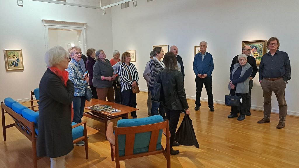 Einen guten Kontrast zum bisherigen Programm bildete die Kuratorenführung durch die Sammlung Ziegler. Teil 2 der Ausstellung im Kunstmuseum befasst sich mit dem Leben und Werk von Marc, Macke, Heckel und Jawlewsky, geht aber über die künstlerischen Einzeldarstellungen hinaus und macht das Sammeln selbst und das Sammlerpaar Ziegler zum Ausgangspunkt der Betrachtung. So entsteht durch Tapeten, Fotografien und historische Möbel eine stimmige Ausstellungskulisse, in der die Bilder ihre private Herkunft lebendig vor Augen führen.