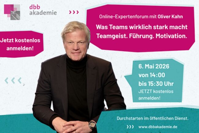 „Höchstleistung ist kein Zufall: Wie Motivation, Teamgeist und Führung Teams stark machen“ Ein Online-Forum der dbb-Akademie am 6. Mai 2026 von 14:00 Uhr bis 15:30 Uhr via Zoom Erfahren Sie mehr auf der Seite der dbb-Akademie: https://www.dbbakademie.de/online-expertenforum/ Foto: dbb-akademie