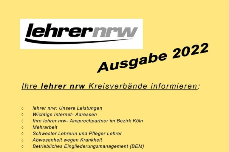 Die lehrer nrw-Mitglieder des Bezirkspersonalrats Köln informieren zur Personalversammlung 2024   Zu den Personalversammlungen der Lehrerinnen und Lehrer im Regierungsbezirk Köln haben die lehrer nrw-Kreisverbände ein Informationsheft mit vielen dienstlich relevanten Informationen zusammengestellt. Sie können es durch einen Klick auf den nachfolgenden Link herunterladen. Zum Informationsheft (PDF-Datei, ca. 2 MB)