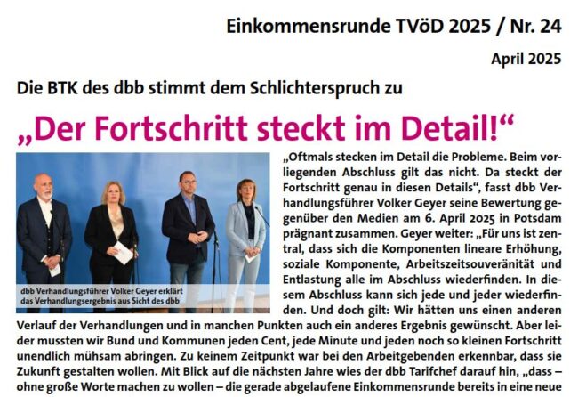 Abschluss nach Schlichtung bei Tarifverhandlungen für Beschäftigte bei Bund und Kommunen! Auch die letzte Wegstrecke zum Tarifabschluss war schwierig und mühselig. Doch nachdem alle Seiten bis an die Grenzen ihrer Kompromissfähigkeit gegangen waren, stand am Ende ein weiter entwickelter Schlichterspruch im Raum, den auch der dbb (Beamtenbund und tarifunion) mit seinen Mitgliedsgewerkschaften mitgehen konnte. Denn…