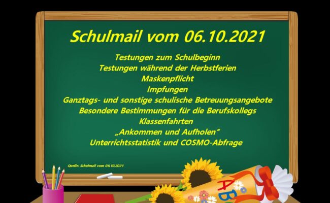 Informationen zum Schulbetrieb nach den Herbstferien Diese Schulmail macht Aussagen zu folgenden Inhalten: Testungen zum Schulbeginn Testungen während der Herbstferien Maskenpflicht Impfungen Ganztags- und sonstige schulische Betreuungsangebote Besondere Bestimmungen für die Berufskollegs Klassenfahrten „Ankommen und Aufholen“ Unterrichtsstatistik und COSMO-Abfrage Text entnommen der Schulmail vom 06.10.2021 Zur Schulmail auf der Seite des MSB