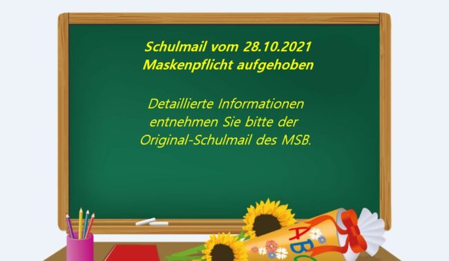 Verzicht auf die Maskenpflicht am Sitzplatz ab dem 2. November 2021 Konkret bedeutet dies: Die Coronabetreuungsverordnung wird ab 2. November 2021 für Schülerinnen und Schüler keine Pflicht zum Tragen von Mund-Nase-Bedeckungen mehr vorsehen, solange die Schülerinnen und Schüler in Klassen- oder Kursräumen auf festen Sitzplätzen sitzen. Die Maskenpflicht entfällt auch bei der Betreuung im Rahmen…