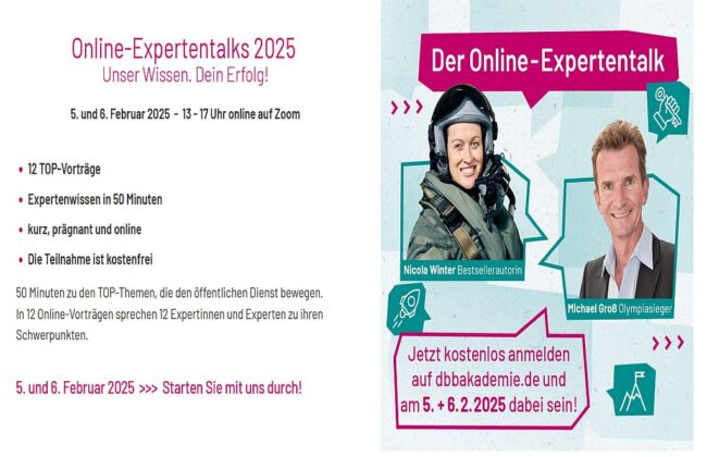 Die dbb Akademie lädt am 5. und 6. Februar 2025 zu zwölf Expertengesprächen ein. „Der Online-Expertentalk der dbb akademie bringt Ihnen – kostenlos – Wissen und Inspiration rund um Themen, die den öffentlichen Dienst bewegen. 12 Sessions erwarten Sie an zwei intensiven Tagen: Künstliche Intelligenz, Motivation, Führung, Konfliktlösung, Tarifrecht, Personalgewinnung u.v.m.“ Entnommen: Flyer dbb Akademie…