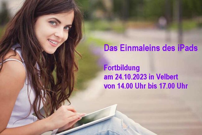 Fortbildung am 24.10.2023 mit Piotr Wysluch und Moritz Becker Thema: „Das Einmaleins des iPads“ Termin: Dienstag, 24. Oktober 2023 von 14:00 Uhr bis 17:00 Uhr Ort: 42549 Velbert, Realschule Kastanienallee, Raum 41, Kastanienallee 32 lehrer nrw Seminar-Nr.: 2023-1024 Inhalt des Seminars: In dieser Veranstaltung werden grundlegende Kompetenzen im Umgang mit dem iPad vermittelt. Die konkreten…