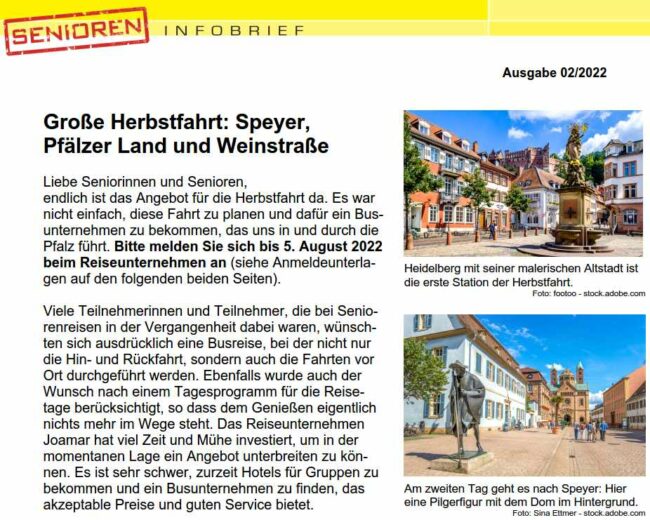 Ausgabe 02/2022 unseres Senioren-Infobriefes Monika Holder, unsere Seniorenbeauftragte, hat für die Seniorinnen und Senioren unseres Verbandes wieder etwas ganz Spezielles ausarbeiten lassen: Eine viertägige Busreise vom 14. bis 17. Oktober 2022 nach Speyer, das Pfälzer Land und die Weinstraße. So stehen auf dem Programm Stadtführung in Heidelberg, Stadtführung und Dombesichtigung in Speyer, eine Schifffahrt auf…