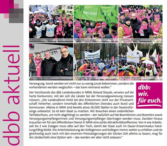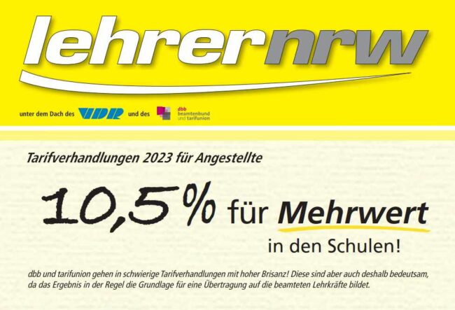 Tarifverhandlungen 2023 Streikaktion des dbb am 05.12.2023 in Düsseldorf Der Verband lehrer nrw ruft seine tarifbeschäftigten Mitglieder zur Teilnahme an den Arbeitskampfmaßnahmen (Streik) mit der Großdemonstration des dbb am 05.12.2023 in Düsseldorf gemeinsam mit den weiteren Mitgliedsgewerkschaften auf. Zur Organisation: Mitglieder des Verbandes lehrer nrw tragen sich bitte rechtzeitig vor Beginn, d. h. ab 9.00…